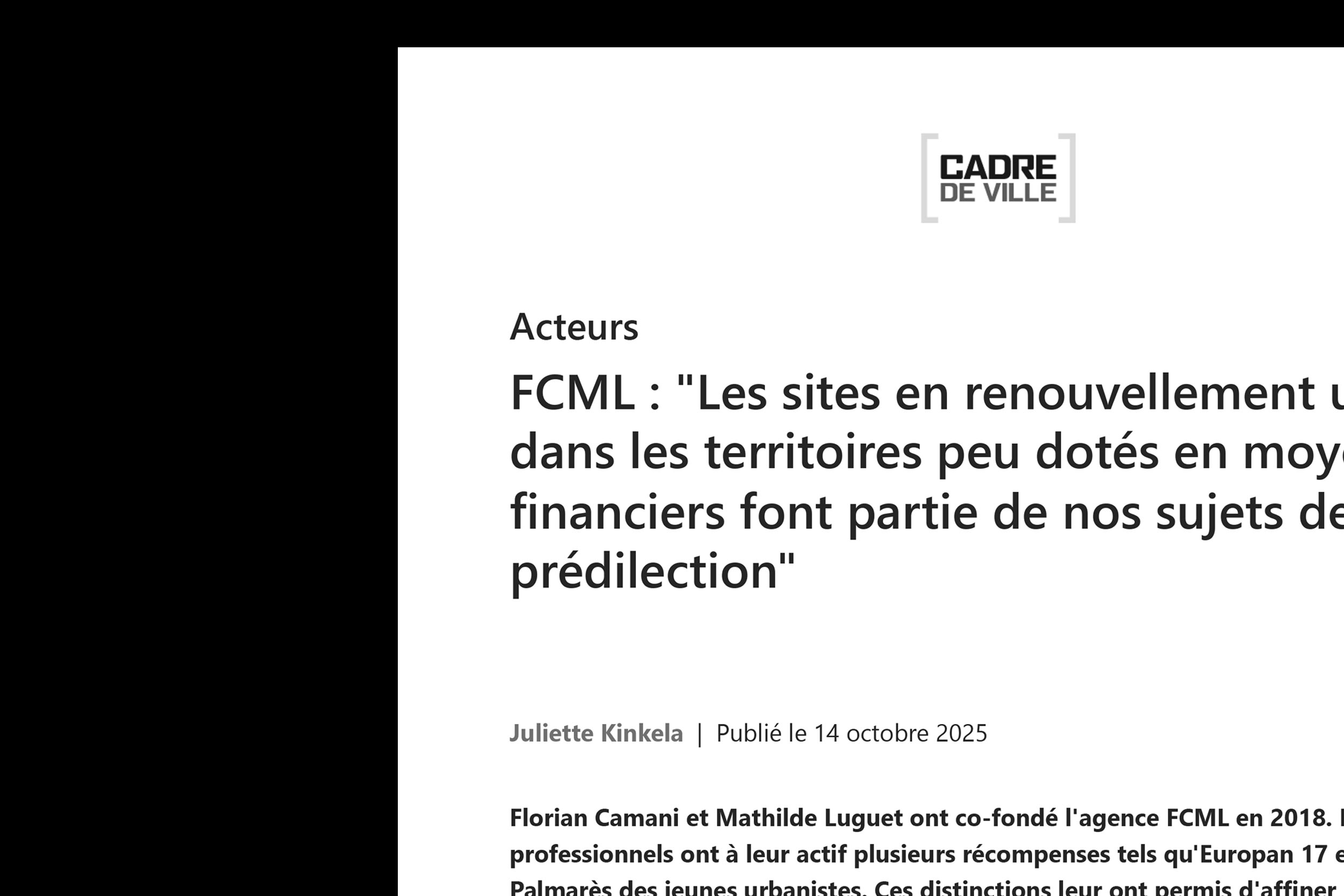 Un grand merci à la revue Cadre de Ville et Juliette Kinkela de nous avoir sollicités pour cet entretien, qui résume à sa manière notre parcours, nos lignes directrices, et quelques perspectives d’avenir ! A lire ici : https://www.cadredeville.com/ville/fcml-les-sites-en-renouvellement-urbain-dans-les-territoires-peu-dotes-en-moyens-financiers-font-partie-de-nos-sujets-de-predilection